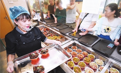 食堂窗口内,清炒时蔬、茄子烧豆角、香菇滑鸡等十来种家常菜整齐摆放,素菜3—5元、荤菜8—12元。78岁的侯菊萍说:“这儿的菜干净实惠,不想做饭就来吃,省心!”身为社区老年模特队成员的她觉得:“社区把老人的事放在心上,日子越过越有滋味。”