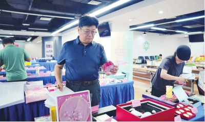 评审会现场,中国旅游协会旅游商品与装备分会专职副会长兼秘书长陈斌(中)和评审组其他成员一起品鉴参选的武汉礼物。