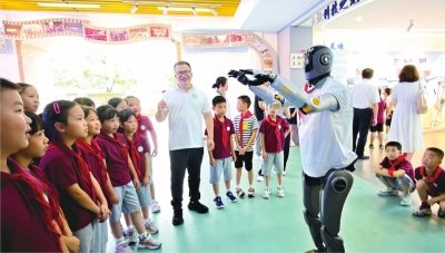 “同学你好!新学期请多指教!”9月1日清晨,孩子们刚踏进光谷十五小校门,就被身着学校专属校服的人形机器人“光光”的特殊问候所吸引。图为“光光”和学生们互动。