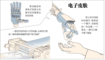 皮肤“肤浅”,皮肤也深刻。对机器人来说,搬起重物并不难,难的是拿起脆弱的物品。当它有了触觉,才有了更强的控制力。安装上电子皮肤的“灵巧手”,能快速判断抓取物品的轻重,并施以合适的抓握力度。一块豆腐、一颗软糖、一个果冻,它都能“信手拈来”,不留痕迹。