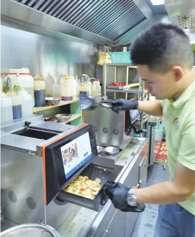 记者看到,后厨与用餐区只隔着一道透明玻璃,工作人员借助两台打印机大小的炒菜机器人加工菜肴。机器人的显示屏上有菜单,工作人员点击要制作的菜肴,再根据提示依次投入食材和调味料。时间一到,一盆色香味俱全的菜肴就可出锅。据了解,一锅菜肴有2公斤至5公斤重,制作只需几分钟,一个人同时操作两台炒菜机器人毫无压力。