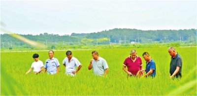 秋分将至,张桥村的连片稻田正由青转黄。江夏区张桥村村支书吴经亮(右一)和村民们走进稻田,查看水稻长势。