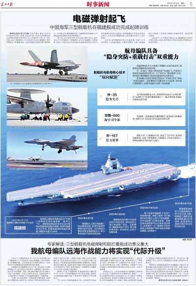 韩维还认为,三型先进舰载机在福建舰上起降成功,还实现了电磁弹射技术对舰载机的“赋能”。一方面,电磁弹射和阻拦这种起降方式,大大提高了预警机出动回收效率,能够保证预警体系持续在线。另一方面,使用电磁弹射,歼-35能以“满油+隐身构型”快速起飞,凭借低可探测性突破敌防空网;歼-15T则可以“满油满弹”升空,依托其大载弹量和大航程实施饱和式对敌攻击。