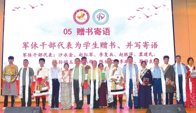 “愿你像奔腾的雅鲁藏布江一样勇往直前、拥抱梦想”“勤奋学习、立志成才、报效祖国,为增进民族团结作出贡献”“读史明智,立志成才”……军休一中心军休干部向“军晖班”捐赠体育用品、行李箱、书籍、服装等物资。在捐赠的书籍上,军休干部们饱含着深情和期望写下一句句寄语。学生们怀着崇敬和感激之情,向军休爷爷敬献象征着纯洁和敬意的哈达。