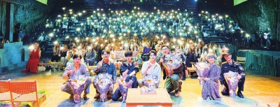 开心麻花欢乐田园沉浸式舞台剧《雨村笔记之隐藏笔记》主创团队与观众合影。