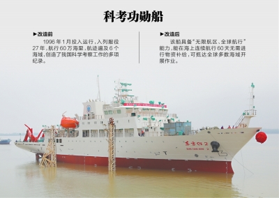 改造升级后,该船具备“无限航区、全球航行”能力,能在海上连续航行60天无需进行物资补给,可抵达全球多数海域开展作业。可同步开展陆架海域与大洋的水文、气象、物理、化学、地质、生物、地球物理七大领域观测研究,实现“一站式综合科考”。