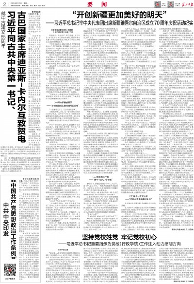 迪亚斯-卡内尔同古巴革命领导人劳尔大将联名致贺电表示,60多年来,古中关系经历时间考验持续发展。双方政治互信深厚,社会主义建设经验交流密切,传统兄弟情谊和友好合作关系不断巩固。古方坚定恪守一个中国原则,反对外部势力干涉中国内政,愿坚定不移推动古中命运共同体建设,反对霸权主义。