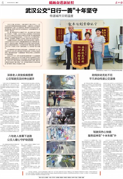 武汉公交“日行一善”活动获得全国第四届“十大运输服务榜样品牌”、全国公交行业“时代先锋”优秀文化品牌称号,获评中国政研会基层思想政治工作优秀案例,获交通运输部高度肯定。武汉公交人用行动证明,文明无需惊天动地,当每一辆公交车都成为流动的“暖心驿站”,每一位驾驶员都成为文明的传递者,城市便有了最动人的温度与力量。