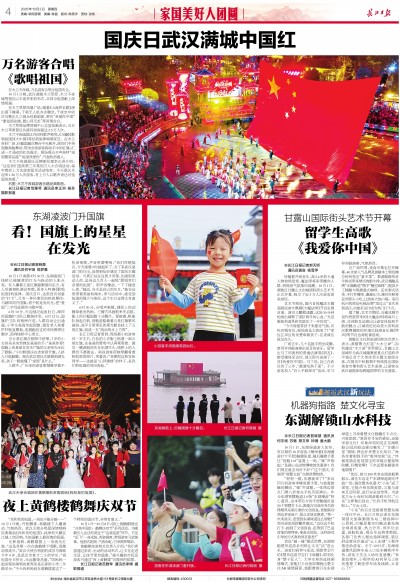 长江日报记者看到,现场最小的游客仅一岁左右,白色的小衣服上贴着一面五星红旗,在爸爸的臂弯中认真观看着。最后一艘游船消失在东湖尽头,栈桥上的人群仍不愿散去。南昌游客范晓琴翻看着相机里的照片,笑着说:“我要把这些发给同学——这就是‘山河锦绣’的样子,是我们和祖国的双向奔赴。”