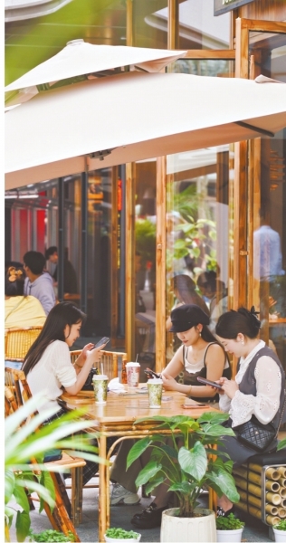 自然绿意“种”进武汉滨江天街的中庭、通道与下沉广场,市民游客在此享受惬意假日。