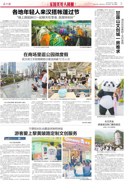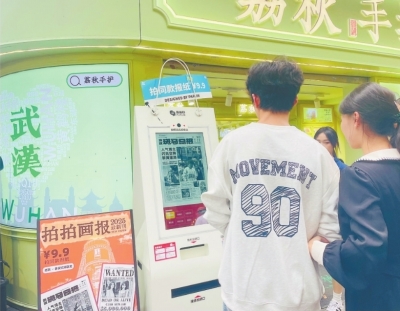 同样吸引游客排长队体验的,还有可拍摄“同款报纸”和“登上头版”的拍照装置。来自长沙的唐女士说:“这里有欢庆国庆、月满中秋、武汉方言等多种报纸模板可供选择,非常有意思。”