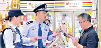 青和居警务团队联合英模背包服务队上门对商户进行反诈宣传。