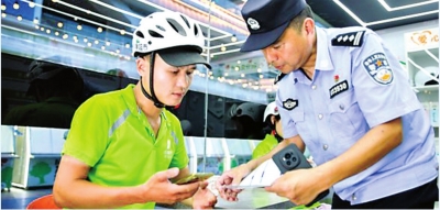 武汉楷模、全市金牌调解员程波向外卖员宣讲反诈知识。