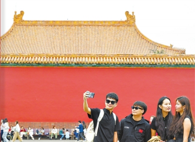 10月3日,游客在故宫拍照留念。曾是皇家专属的禁苑,如今成了万民可入的文化殿堂。