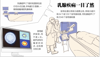 在我国,乳腺癌的筛查以常规超声为主,但面临医生不足、检测结果依赖医生经验等问题,乳腺癌筛查一直未能大范围开展。这款乳腺超声CT比传统B超好,关键是它的信号处理更出色。