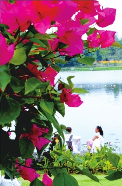 三角梅热烈盛放,透过花枝望去,湖水平静如镜。湖畔,游人在此休憩,享受美好时光,好一幅恬淡的画面。