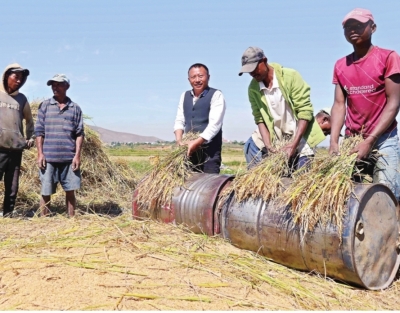 2023年5月12日,在马达加斯加首都塔那那利佛附近的马义奇镇,中国杂交水稻技术专家胡月舫(右三)在中国国家杂交水稻工程技术研究中心非洲分中心的试验田里和当地农民一起收获水稻。