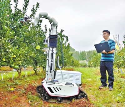 10月17日,长江日报记者走进华中农业大学柑橘试验田看到,橘子橙子挂满枝头,即将成熟。一台高2米、宽1米左右的机械装置正在田间自如行走,科研人员在平板电脑上轻点,机械臂潇洒挥动,将果子握住、剪下,放入筐里,一气呵成。
