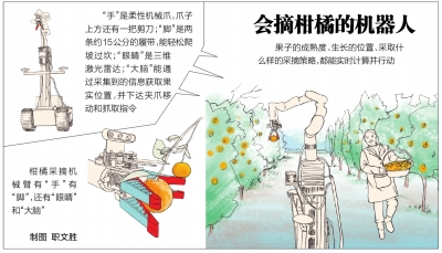这些年,用于苹果、猕猴桃的采摘智能设备都面世了,柑橘采摘设备的研发仍是业界难点。我们花4年研发出一款柑橘采摘机械臂,有“手”有“脚”,还有“眼睛”和“大脑”。