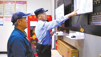 李万水与民警向光瑜(右)查看小区电梯监控。