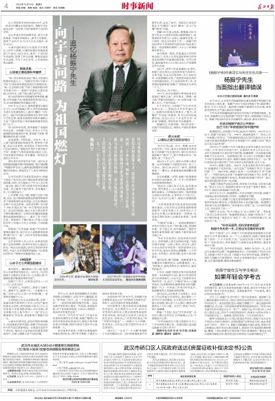 从清华园的青涩少年到诺贝尔领奖台上的华人骄傲,从规范场理论的奠基者到三尺讲台上的大先生,他用一个世纪的生命旅程,取得了峙立如嵩、博观如海的学术成就,书写了功在世界、心怀家国的隽永篇章。