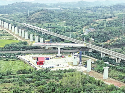 此次完成跨越的T构转体连续梁长96米,横跨京九铁路,且转体连续梁紧邻沪蓉铁路,桥梁边缘距离铁路接触网最近处不足18米。而沪蓉铁路作为中国东西向铁路大动脉,高峰时段平均每两三分钟就有一趟列车呼啸而过,给施工带来挑战。