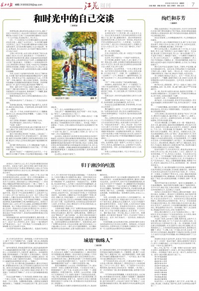 所以,如果我有机会重返往日时光,我不会和那个少年讲授我对于自我与时间关系的思考,也不去探讨文学创作和艺术观念,我甚至都不必告诉那个少年,“我就是将来的你”。那么,我是谁?我以何种方式与那个少年对谈?我想,我只是那适时到来的电流和提前结束的电视节目。我是孤单地立在街角随时准备迎纳一份退稿的绿色邮筒,是一轮每天正常升起却被少年赋予特别意义的太阳,是恰好开始的广播,甚至是许给少年奖赏随风飘散的炸油条的香味儿……
