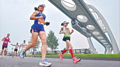参加光谷马拉松的选手与“光谷光子号”空轨列车同框。