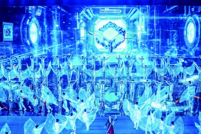 文体展演,声光电在影中共舞。舞台大屏上,江水奔涌与机械齿轮影像交织呈现,演员队形亦随光影与律动变换,形成富有层次、动感十足的视觉画面。智能汽车巡游、全息投影、AI视频技术和立体LED屏幕系统广泛运用,打造沉浸式观演体验,在厚重历史底蕴中透出强烈的未来感。