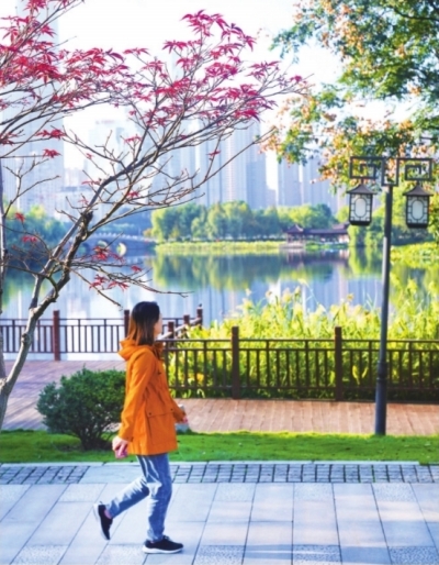 10月22日,一市民在武昌沙湖公园周边漫步晨练。