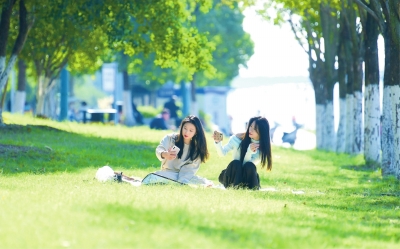 10月23日,武昌江滩五期小白塔附近,两个爱美的姑娘在阳光下拍照片。