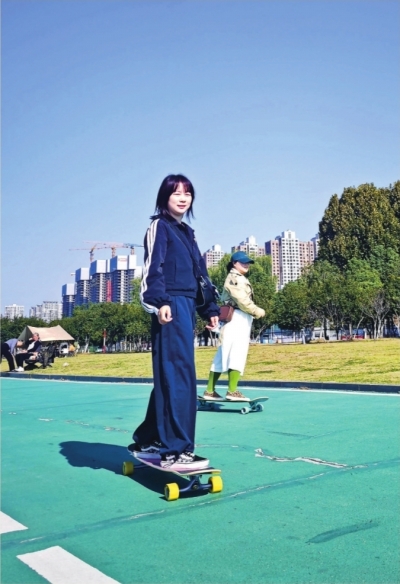 10月23日,一女孩在武昌江滩五期步道上玩滑板。