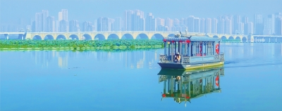 近日,汉阳墨水湖湖面,游客乘坐游船赏景。