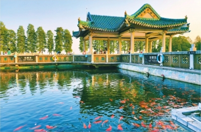 近日,东湖听涛景区内,成群的红鲤在水中游动,人们在古色古香的亭子里悠闲地观鱼。