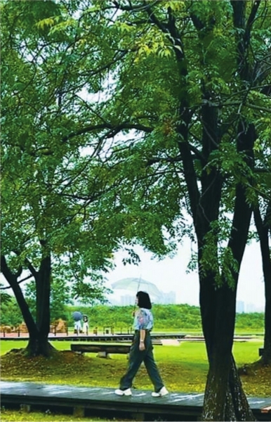 近日,游客在盘龙城国家考古遗址公园内边散步边欣赏秋景。