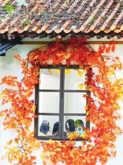 10月24日,解放公园一白墙上的窗户周围缠绕着大量红橙相间的枫叶,窗户内的游客正在悠闲地聊天。