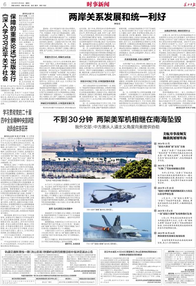 当地时间同日15时15分,隶属美海军第22战斗攻击机中队的一架F/A-18F“超级大黄蜂”战斗机从航母起飞执行任务时坠海,两名飞行员弹射逃生,也被救出。