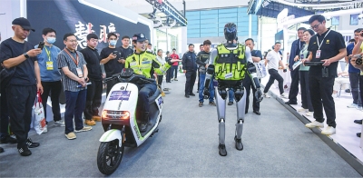 在武汉举办的第十五届中国国际道路交通安全产品博览会上,光谷东智的人形机器人和交警一起巡逻。