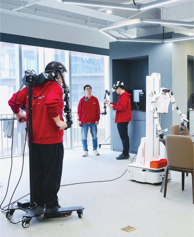 踏入“机器人学校”的家居场景,机器人们有的正在学习如何叠衣服,有的则轻轻拿起抹布,学习如何控制力度擦桌子。机器人的身侧,机器人训练员头戴VR设备,手持感应设备,与机器人同步“工作”。