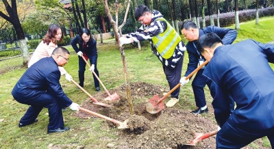 检察官、法官与人大代表、政协委员、园林部门工作人员合力补栽紫薇树苗。