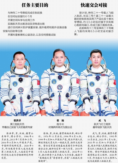 神二十一乘组依旧按照“新老搭配,以老带新”的方式选拔,我国第二批航天员张陆时隔两年多再度叩问天宫,以丰富经验扛起指令长重任;第三批航天员武飞、张洪章分别以航天飞行工程师、载荷专家的身份首度圆梦太空。