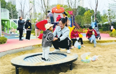 11月3日上午,众多家长带着孩子前来游玩。况清家住汇福园C区,她的孩子才1岁9个月。“我在这里住了十年,以前带孩子想找一个游乐场,至少要走两三公里。现在出了门5分钟就能到,只要天气好,我每天都要带孩子出来转转。”秋千、滑滑梯、跷跷板等设施吸引了许多孩子,游乐园里到处都是欢声笑语。