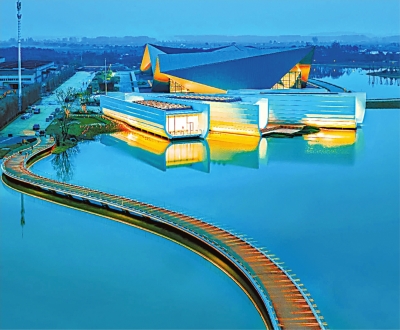 沉湖国际小镇分会场如“折纸飞鸟”,栖息于水天之间。