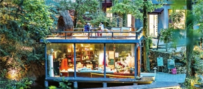 游客在位于静谧深林的樾和林泉民宿感受慢生活。