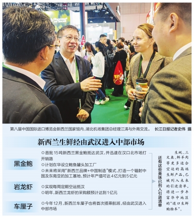长江日报上海讯(特派记者冯雪)“我们刚从新西兰引进的黑金鲍,在武汉卖得很不错!”11月6日,第八届中国国际进口博览会新西兰国家馆内,湖北机场集团总经理江涛向新西兰驻华大使馆代表热情地介绍。