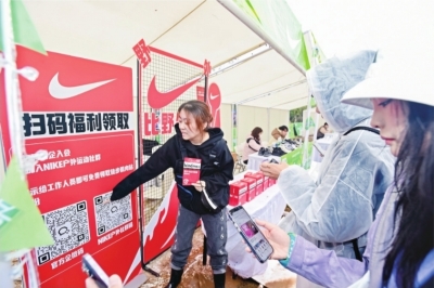 一户外运动品牌展位前,户外运动爱好者扫码领取福利。