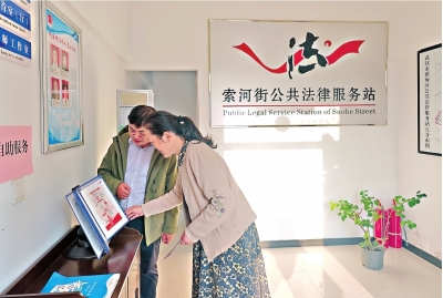 索河司法所工作人员为村民介绍升级后的公共法律服务站功能。
