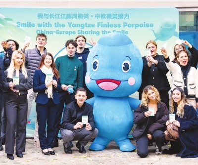 “知音湖北 大美长江”湖北文旅巴黎推介会现场,众多法国青年参与“我与江豚同微笑”活动。