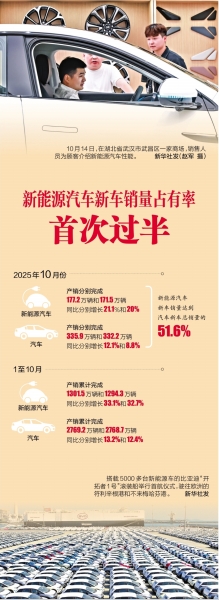新华社北京11月11日电(记者唐诗凝)中国汽车工业协会11月11日发布数据显示,2025年10月份,我国新能源汽车产销同比保持快速增长,新能源汽车新车销量达到汽车新车总销量的51.6%,占有率首次过半。