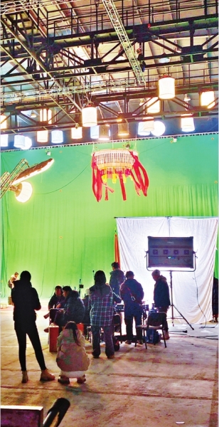 微短剧拍摄组在1号片场绿幕区打光拍摄。